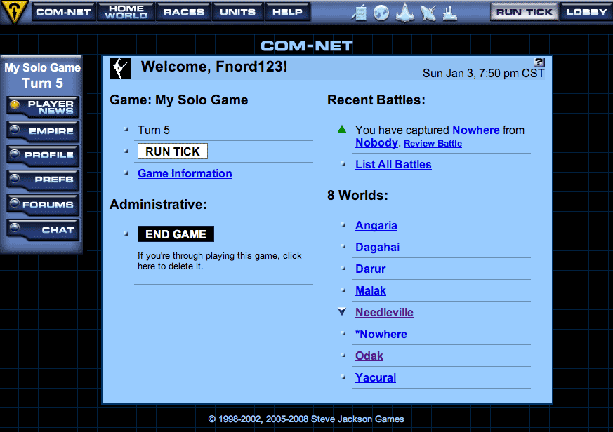 To access your Player News page from anywhere within UltraCorps, click the COM-NET button at the top of the screen. Game InformationThis section tells you the turn number and next scheduled tick. It also links to the detailed Game Information page and to Player Rankings.HeadlinesHeadlines display below Game Information. They are in-game news . . . be sure to read the new headlines every turn! To display any headline topic, just click it. UltraMailAny new UltraMail (the in-game email sent by other players) appears here. By clicking a message, you can read and reply to it. Or you can click on the sender's name to get information about him. ForumsEach game has its own in-game forum, exclusively for that game's players. The Forum link will take you straight to the forum for the game you are in. There is also a Forums button in the ComNet sidebar, which will take you to the general forums area. Recent BattlesBattle News appears at the top right. It shows all your combats on the last tick. "Captured From" and "Defended From" results are good news - you won the battle. These are indicated by green arrows. "Captured By" means somebody took one of your worlds. "Defended By" means your attack on that world was a failure. (You won't have to punish the commander; a fleet which loses is wiped out to the last being.) Lost battles are indicated by red arrows. Click Review Battle to check out the round-by-round action, or click a world name to view its World Information page. At the bottom of the battle listing is a link that will let you List All Battles you have had in the entire game. WorldsBelow the battle news is a listing of every world in your empire. Asterisks (*) indicate worlds that you conquered on the previous tick. Clicking a world name takes you to its World Information page and shows its position on the Star Map. |