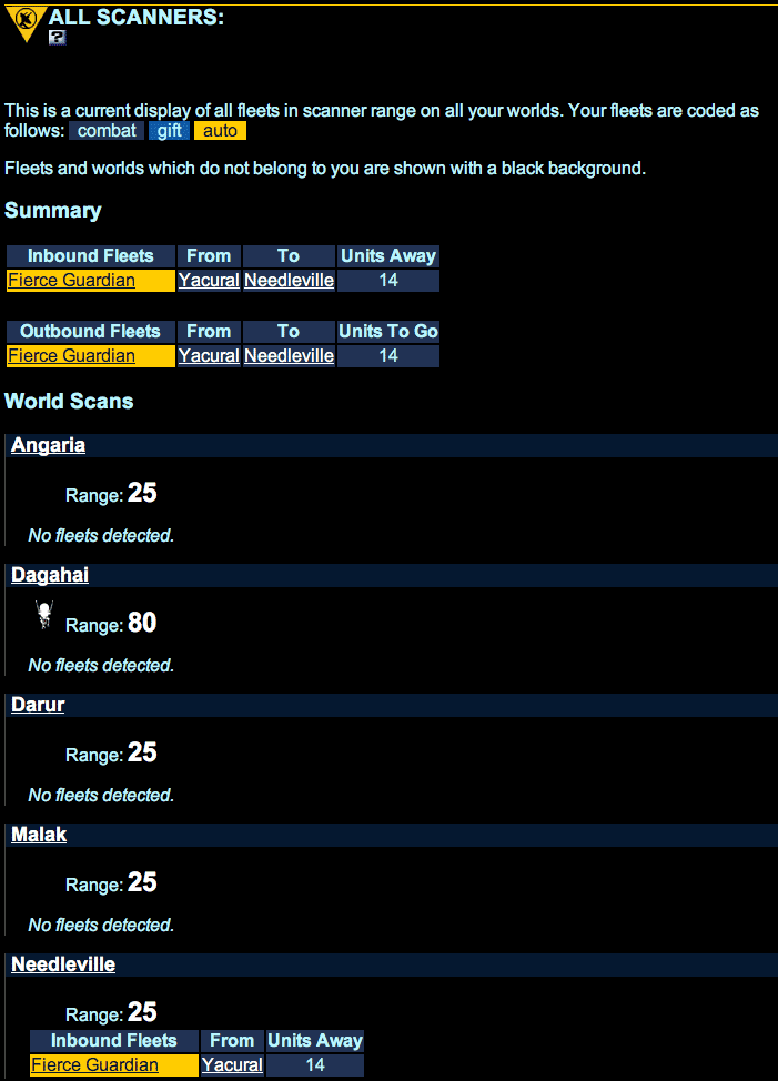 The All Scanners page lists all worlds in your empire and shows their scan range and everything they detect. This page is especially helpful for spotting incoming enemy fleets. It shows the world that detects the fleet (Detected At), the world where it originated (From) and/or the target world where it is headed (To), and how many grid units it has to go.