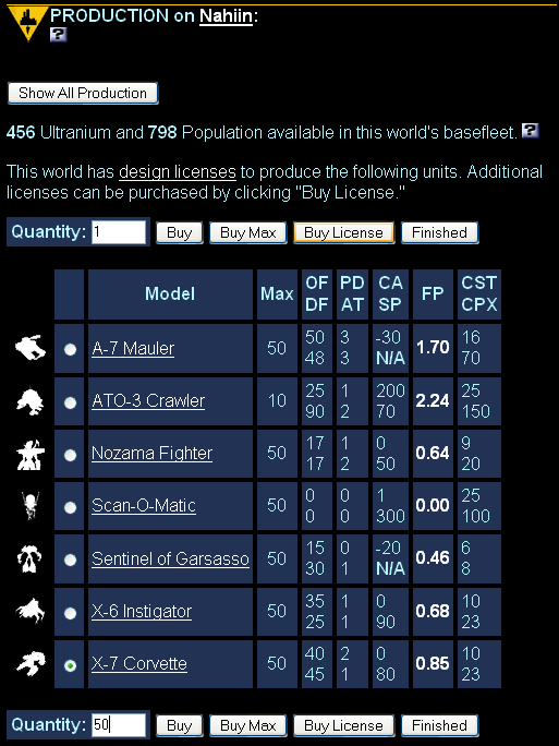 - On a World Information page, click New Order to display the Production page. This page shows the list of units that can be built on that world. See Licenses to learn how to add other units to this list.